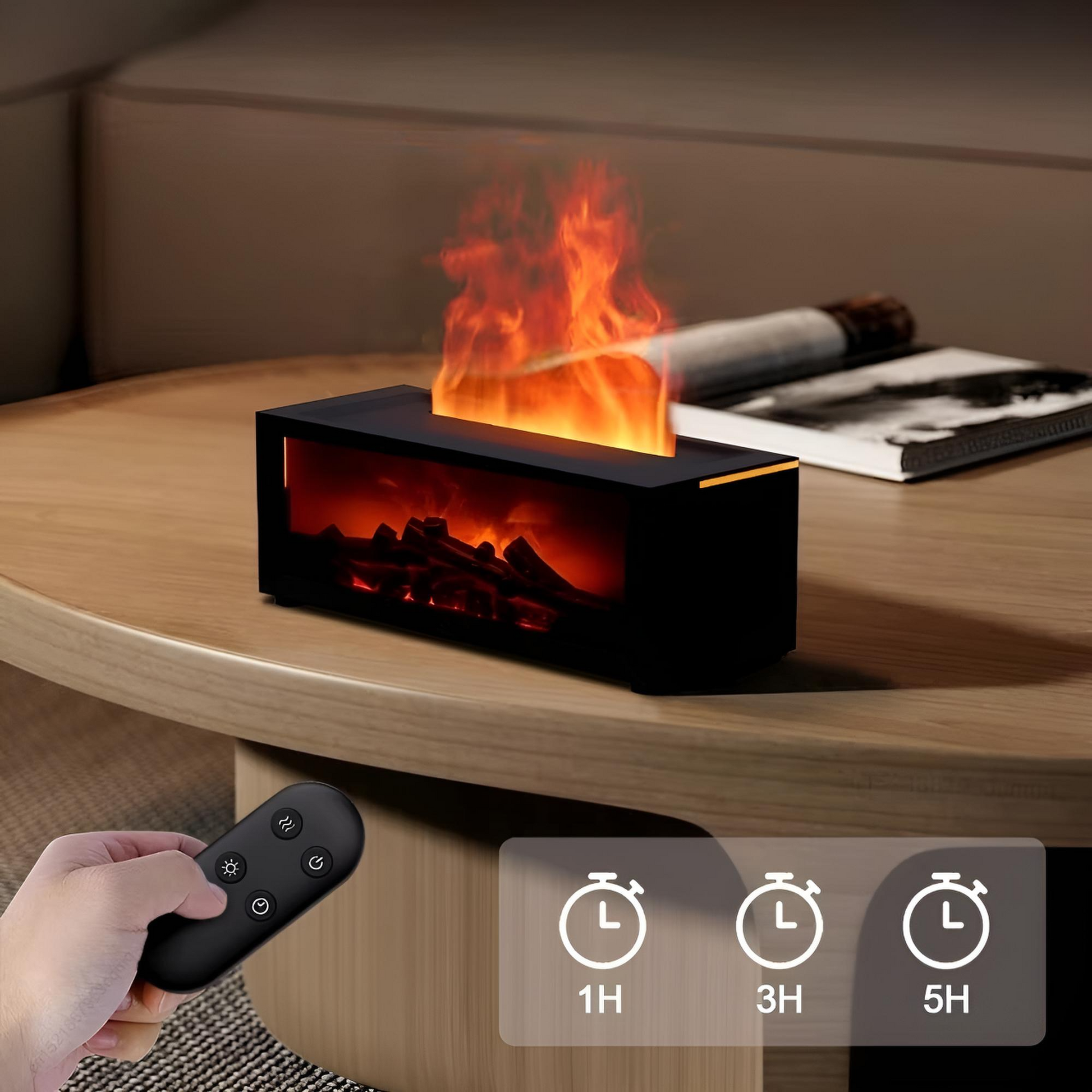 Its fireplace-inspired flame, wooden finish, and ambient colors make Flamora™ a stunning décor accent and a memorable gift.